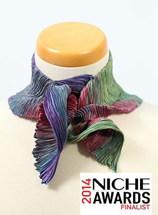This playful accessory was created using innovative Japanese shibori shaping techniques. This wearable art piece is alive with movement, texture and dimension, and can be endlessly transformed by the wearer into unique wearable sculptures. Frill Scarf has received a 2014 Niche Award nomination!